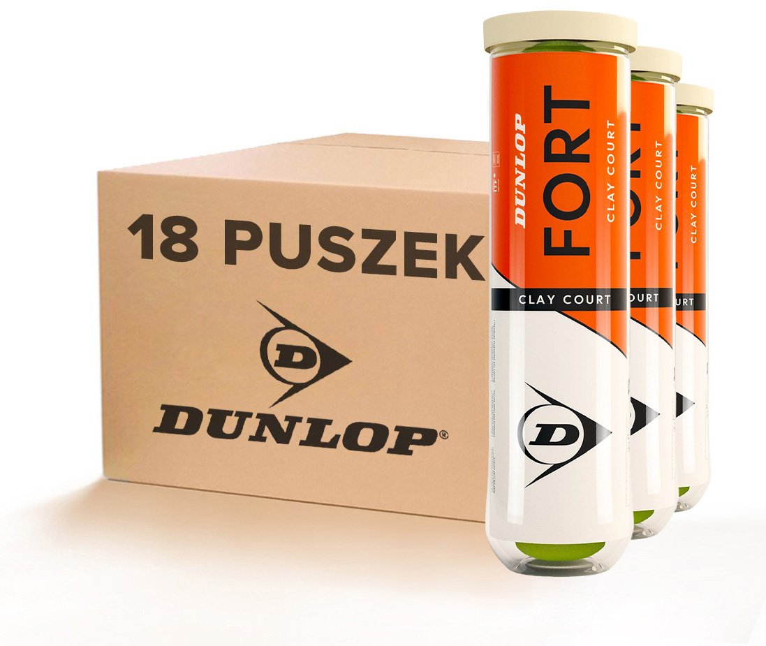 W opakowaniu znajdziesz 18 puszek piłek tenisowych marki Dunlop (plastikowa puszka).