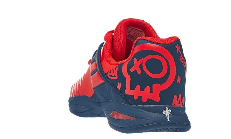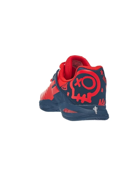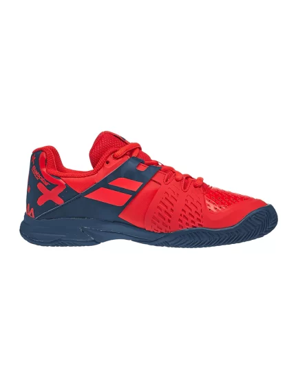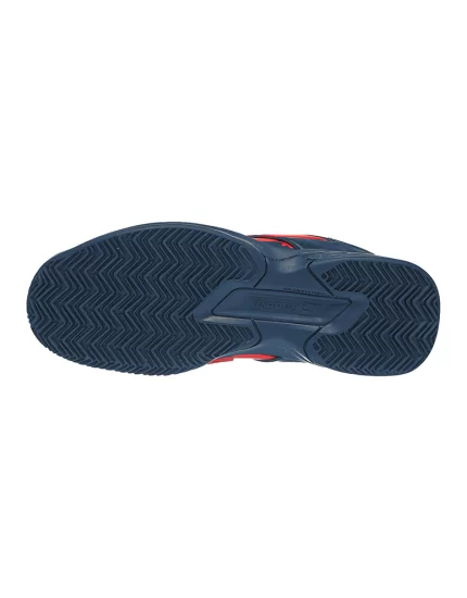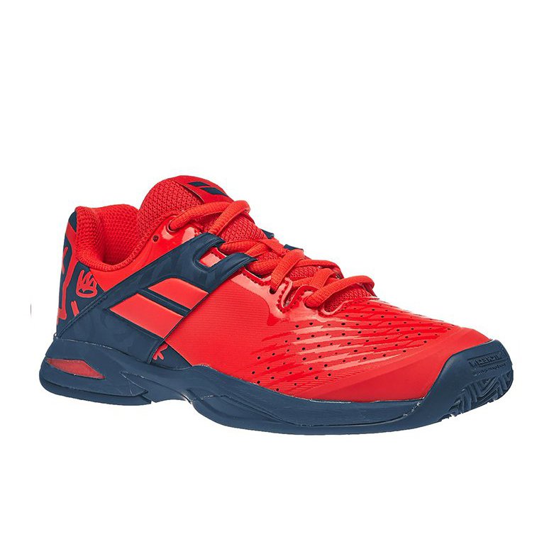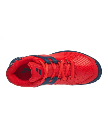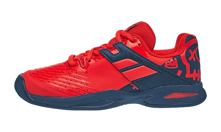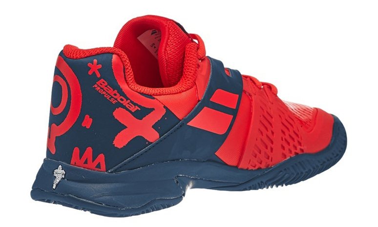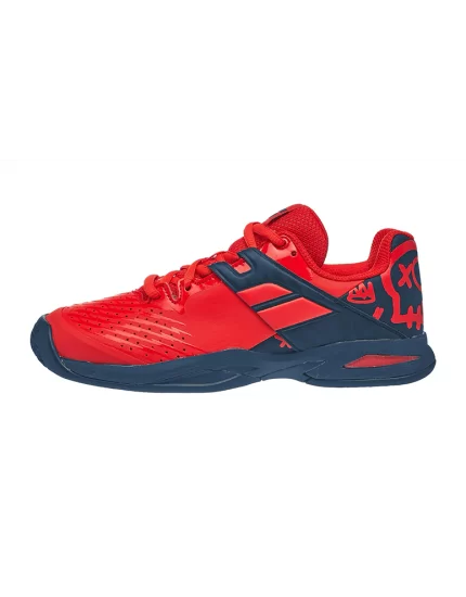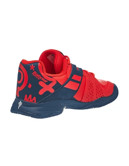Nowe, czerwono niebieskie, juniorskie buty do tenisa Babolat Propulse Clay Junior Geraldine Blue z kolekcji na 2020 rok. Posiadają specyficzne młodzieżowe wzory w tylnej części obuwia.