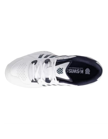 Męskie buty do tenisa K-Swiss Receiver V w białym kolorze przeznaczone są do gry na nawierzchni ziemnej. Obuwie Receiver posiada bardzo lekką cholewkę, która zapewnia wydajną wentylacją stopy i wygodę na bardzo wysokim poziomie. Podeszwa środkowa w tym modelu butów K-Swiss oferuje stabilność i pozwala na świetne czucie kortu.